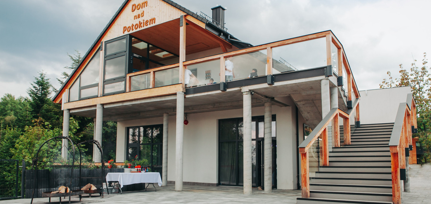 Na piętrze Domu nad Potokiem znajduje się kameralna przestrzeń idealna na mniejsze spotkania biznesowe, firmowe kolacje czy rodzinne bankiety. Goście mają do dyspozycji przeszklony salonik, jadalnię z w pełni wyposażoną kuchnią oraz zadaszony taras, który latem sprawdza się jako dodatkowa strefa relaksu.